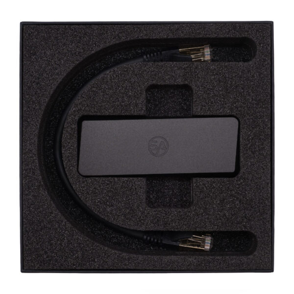 Der Stack Audio SmoothLAN sorgt für eine galvanische Trennung zwischen dem Ethernet-Netzwerk und der HiFi-Anlage. Er erlaubt Datengeschwindigkeiten von bis zu 100 Mbit/s und wird mit einem 25 Zentimeter langen CAT7-LAN-Kabel mit sauerstofffreien, vergoldeten Kupfersteckern geliefert (zum Anschluss an den Streamer/Server).